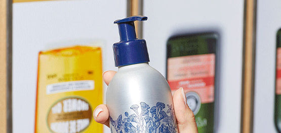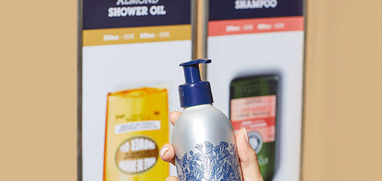 Vaš izbrani izdelek vam pretočimo v lično kovinsko posodico s potisno pumpico za trajno uporabo (250 ml ali 500 ml), izdelano iz 100-% recikliranega in reciklabilnega aluminija. Enota za dezinfekcijo pred polnjenjem stekleničko temeljito očisti s pulzirajočo svetlobo.