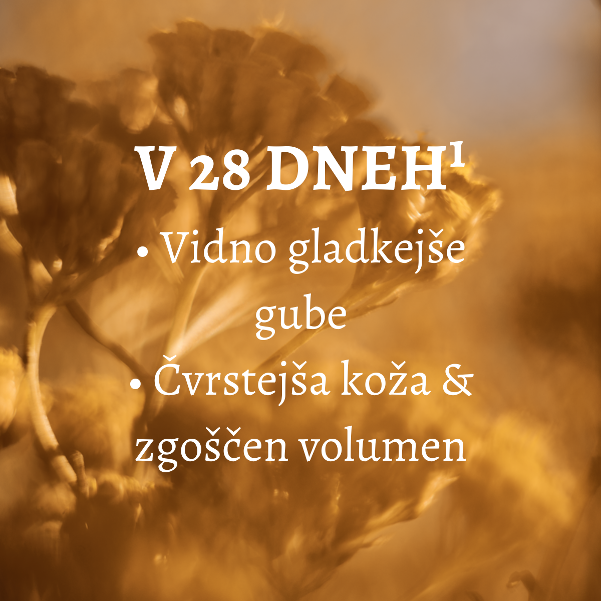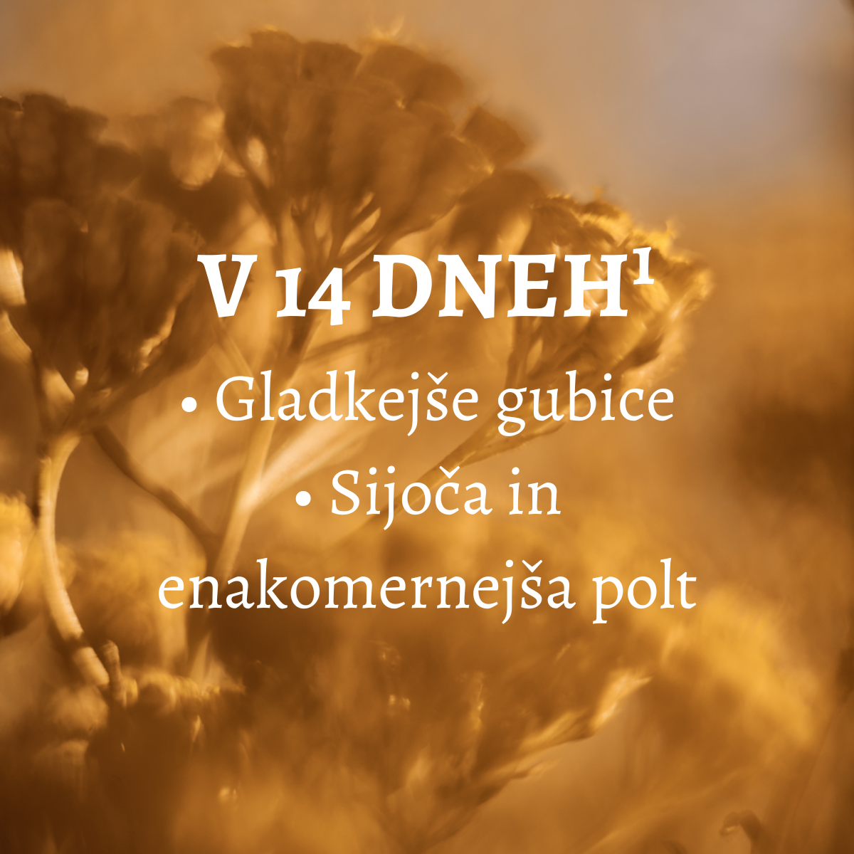Formula vsebuje izvlečke naravnega izvora, vključno z eteričnim oljem immortelle, ki je dvakrat učinkovitejše od vitamina E*, in superizvlečkom iz immortelle, ki je enako učinkovit kot retinol, obenem pa nežnejši do kože**. Ta sestavina pa zdaj dokazano deluje na pigmentacijo in je učinkovitejša tudi od vitamina C**!