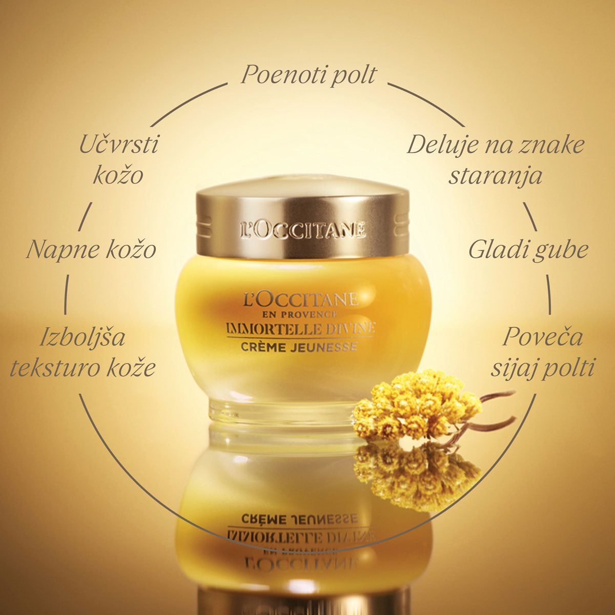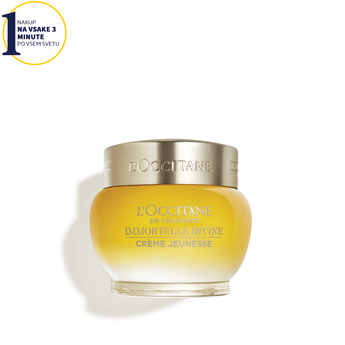 Ekipa L’Occitane je odkrila antioksidativno in pomlajevalno delovanje eteričnega olja immortelle, ki ga pridobivajo na Korziki. Pomaga izboljšati čvrstost kože in zmanjšati gube. -